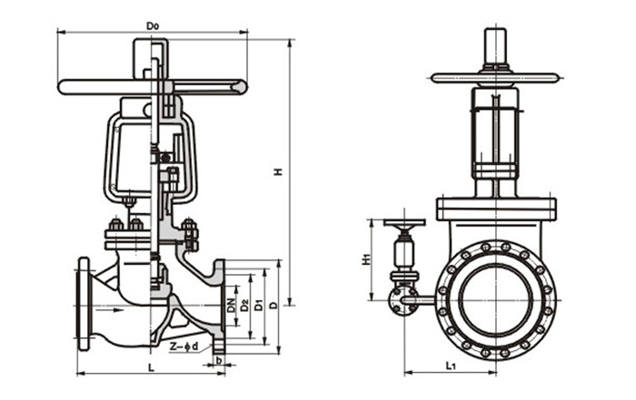 2、介質流向:PN≥1.6MPa、DN≤100介質由閥瓣下方流入閥瓣上方(即低進高出),DN≥125介質由閥瓣卜方流入下方(高進低出)o對于DN≥125的閥門采用介質高進低出的流向,一方面足內旁通閥結構上的需要,另一方面由于介質壓力的作用使閥門的關閉力大大減小。
